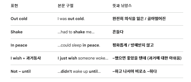 - Out cold: 보통 기절하거나 술에 취해 필름이 끊겼을 때도 쓰지만, 여기서는 누가 업어가도 모를 정도로 "깊이 잠든 상태"를 뜻합니다.
